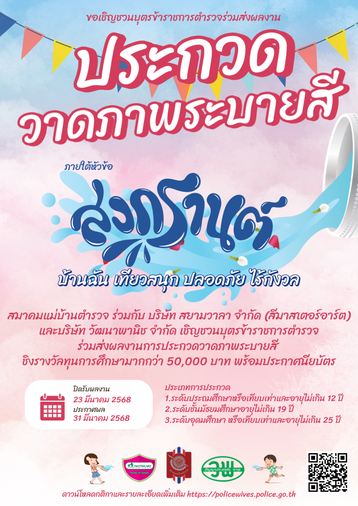 สมาคมแม่บ้านตำรวจจัดกิจกรรมประกวดวาดภาพระบายสี “สงกรานต์ บ้านฉัน เที่ยวสนุก ปลอดภัย ไร้กังวล” ในหัวข้อเกี่ยวกับมุมมองของเยาวชนในประเพณีสงกรานต์ ที่จะสะท้อนให้เห็นถึงความหลากหลายทางด้านวิถีชีวิต และวัฒนธรรมแต่ละพื้นที่ในประเทศไทย ซึ่งเป็นหนึ่งในโครงการส่งเสริมศักยภาพบุตรข้าราชการตำรวจ โดยผู้ชนะการประกวดแต่ละระดับจะได้รับเงินรางวัลพร้อมประกาศนียบัตร และรูปภาพที่ชนะการประกวด ทางสมาคมแม่บ้านตำรวจจะนำไปใช้ในสื่อประชาสัมพันธ์การท่องเที่ยวประเพณีสงกรานต์อย่างปลอดภัย ร่วมกับหน่วยงานที่เกี่ยวข้องในสังกัดสำนักงานตำรวจแห่งชาติ