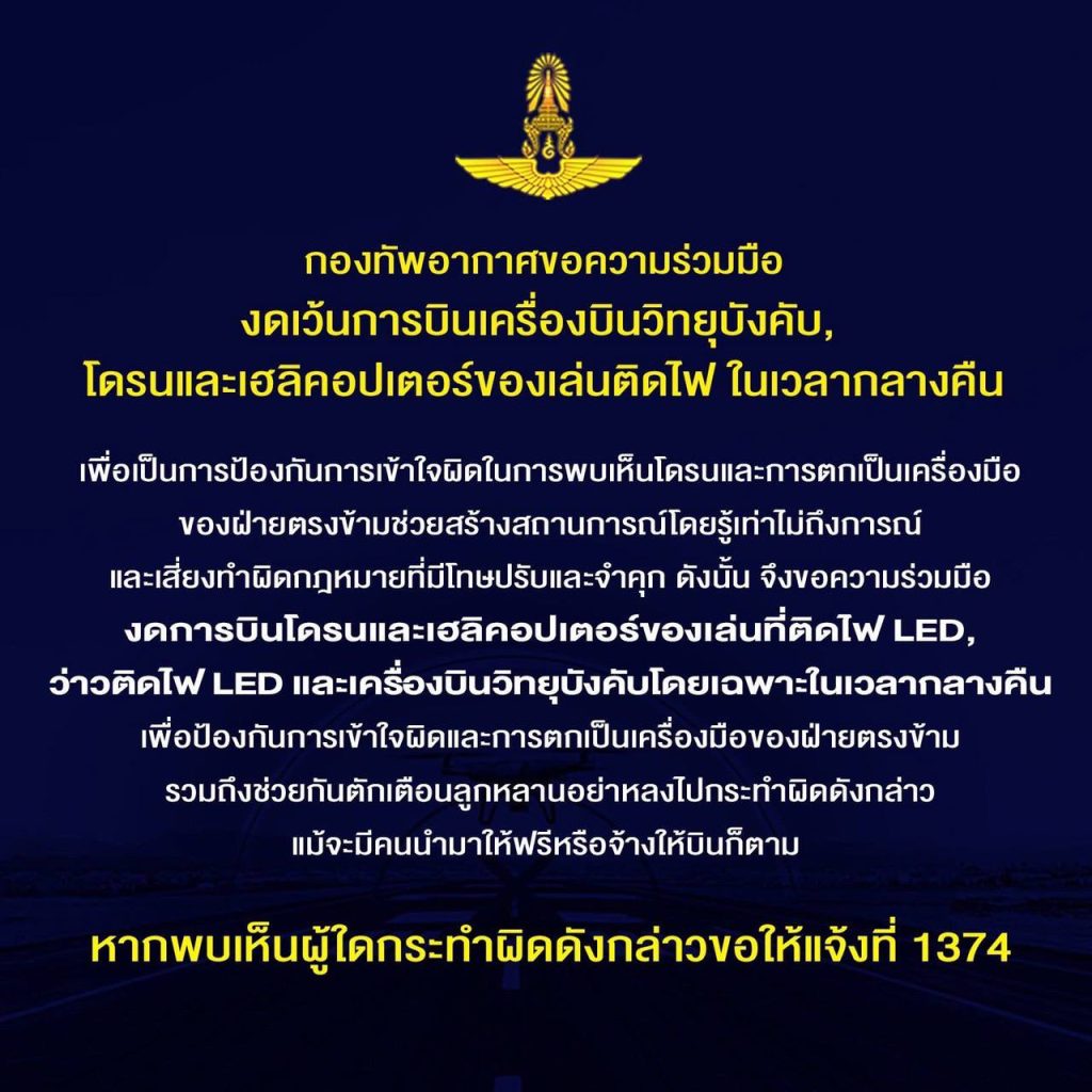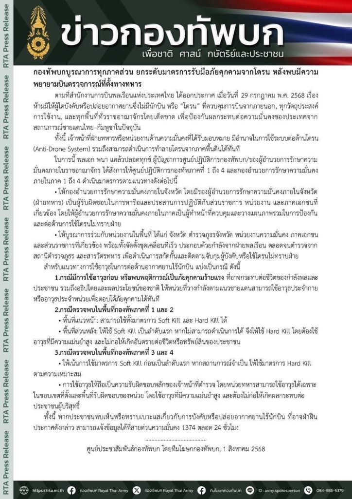 ตามที่สํานักงานการบินพลเรือนแห่งประเทศไทย ได้ออกประกาศสํานักงานการบินพลเรือนแห่งประเทศไทย เรื่อง ห้ามบังคับหรือปล่อยอากาศยานซึ่งไม่มีนักบิน ประเภทอากาศยานที่ควบคุมการบินจาก ภายนอก (Drone) ในพื้นที่ที่อาจกระทบต่อความมั่นคงของประเทศในช่วงสถานการณ์ชายแดนไทย – กัมพูชา พ.ศ.2568 ประกาศ ณ วันที่ 29 กรกฎาคม พ.ศ. 2568 เพื่อป้องกันผลกระทบต่อการรักษาความปลอดภัย ความสงบเรียบร้อย และความมั่นคงของประเทศในสถานการณ์ชายแดนไทย – กัมพูชา
