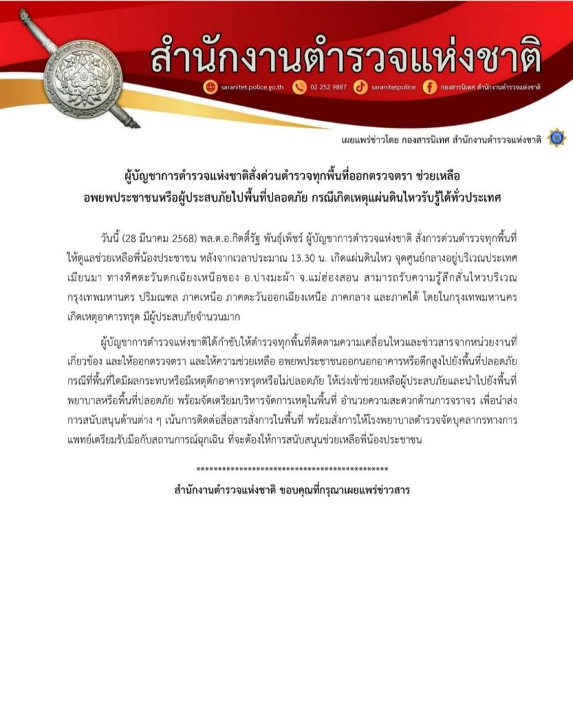 วันนี้ (28 มีนาคม 2568) พล.ต.อ.กิตติ์รัฐ พันธุ์เพ็ชร์ ผู้บัญชาการตำรวจแห่งชาติ สั่งการด่วนตำรวจทุกพื้นที่ ให้ดูแลช่วยเหลือพี่น้องประชาชน หลังจากเวลาประมาณ 13.30 น. เกิดแผ่นดินไหว จุดศูนย์กลางอยู่บริเวณประเทศเมียนมา ทางทิศตะวันตกเฉียงเหนือของ อ.ปางมะผ้า จ.แม่ฮ่องสอน สามารถรับความรู้สึกสั่นไหวบริเวณกรุงเทพมหานคร ปริมณฑล ภาคเหนือ ภาคตะวันออกเฉียงเหนือ ภาคกลาง และภาคใต้ โดยในกรุงเทพมหานคร เกิดเหตุอาคารทรุด มีผู้ประสบภัยจำนวนมาก