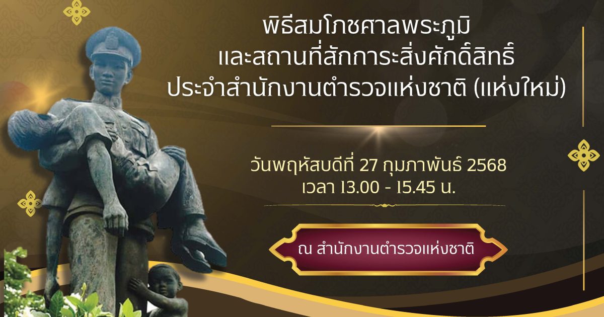 วยวันพฤหัสบดีที่ 27 กุมภาพันธ์ 2568 เวลา 13.30 น. ตร.จะจัดพิธีสมโภชศาลพระภูมิ และสถานที่สักการะสิ่งศักดิ์สิทธิ์ประจำสำนักงานตำรวจแห่งชาติ (แห่งใหม่) ณ สถานที่สักการะสิ่งศักดิ์สิทธิ์ประจำสำนักงานตำรวจแห่งชาติ (แห่งใหม่) บริเวณหน้าหอพระนิรันตราย สำนักงานตำรวจแห่งชาติ โดยมี พล.ต.อ.กิตติ์รัฐ พันธุ์เพ็ชร์ ผบ.ตร. เป็นประธาน